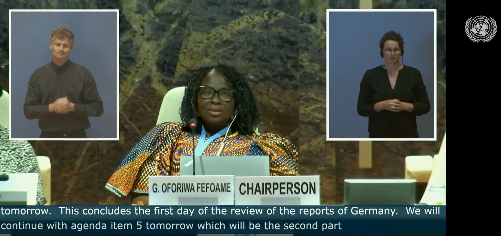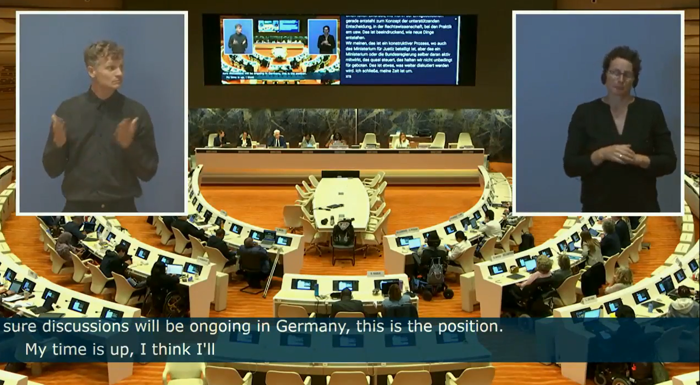 Die beiden Anhörungen wurden vom Englischen ins Französische, Spanische, Arabische und Deutsche übersetzt, in Internationale und Deutsche Gebärdensprache gedolmetscht und in englische und deutsche Schriftsprache umgewandelt. Für Letzteres wurde uns von den United Nations die Dolmetschkabine von Kolleg*innen zur Verfügung gestellt, die bei anderen Anhörungen ins Portugiesische übersetzen :)